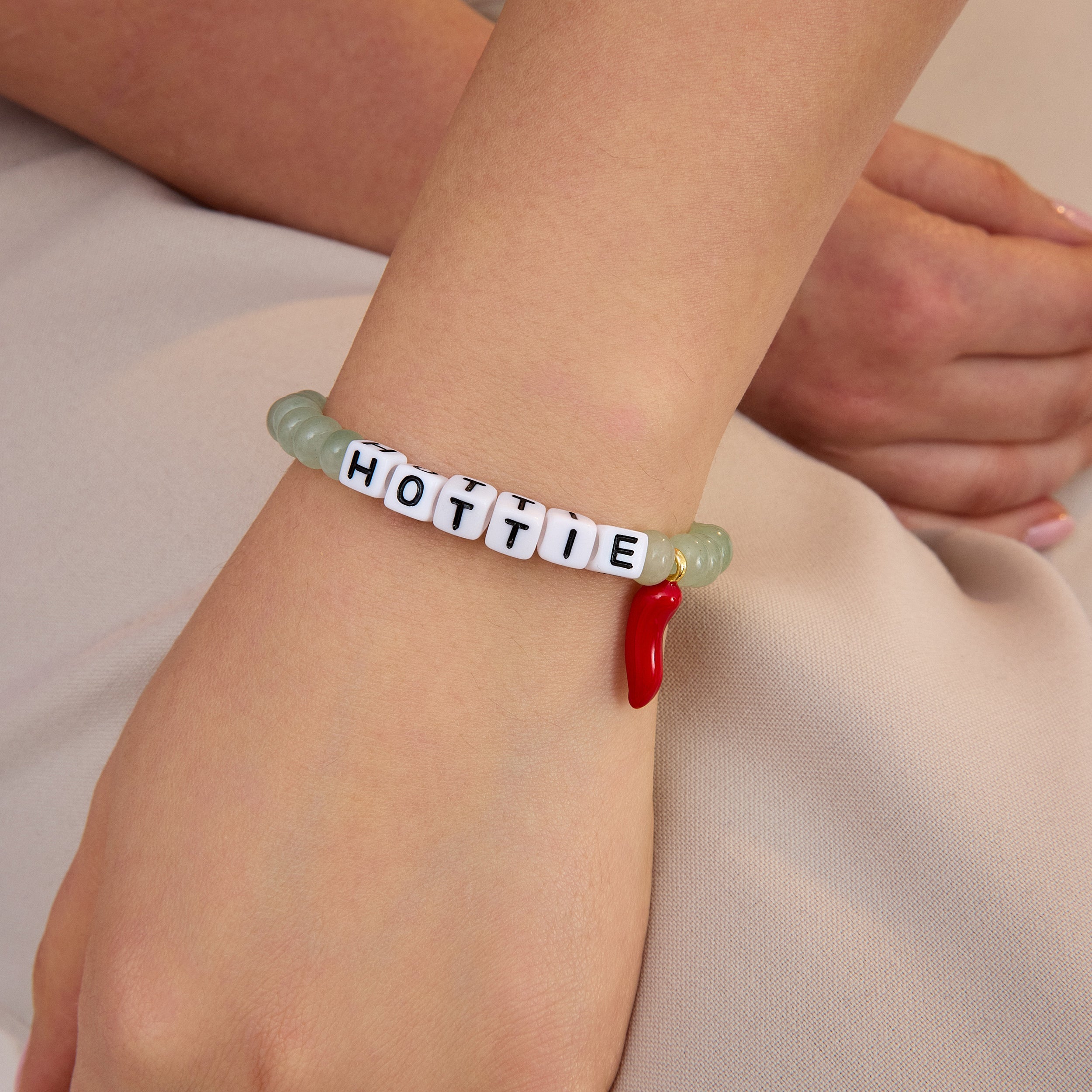 🌶️ Kendine güvenen ve enerjisi yüksek ruhlar için tasarlanmış Hottie Bileklik, “HOT” ruhunu taşıyan yazı boncuğu ve kırmızı biber detayıyla dikkat çeker. Doğal aventurin taşı ise bu bilekliğe hem estetik hem de dengeleyici bir enerji katar.