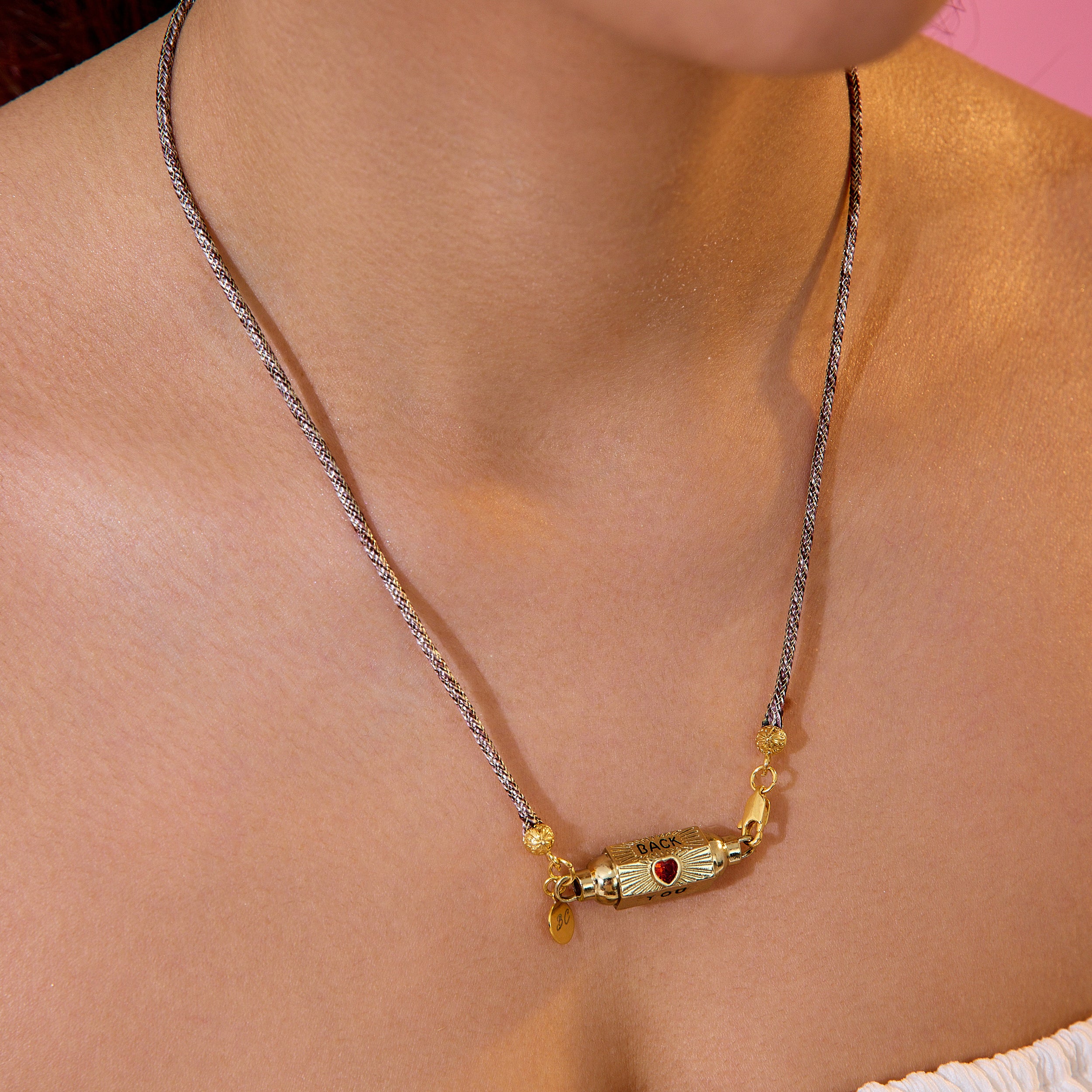 ❣️Sevgiye, kendine, sonane ya da en derin bağlarına bir dönüş. Altın renkli ayrıntılar ve ip örgü zinciriyle hem güçlü hem zarif; kişilerinki “dönüş”ün sembolüdür. Aşka Dönüş Kolye, başkalarının sevgisini taşırken kendini anlatırken sözünü de hatırlatır.