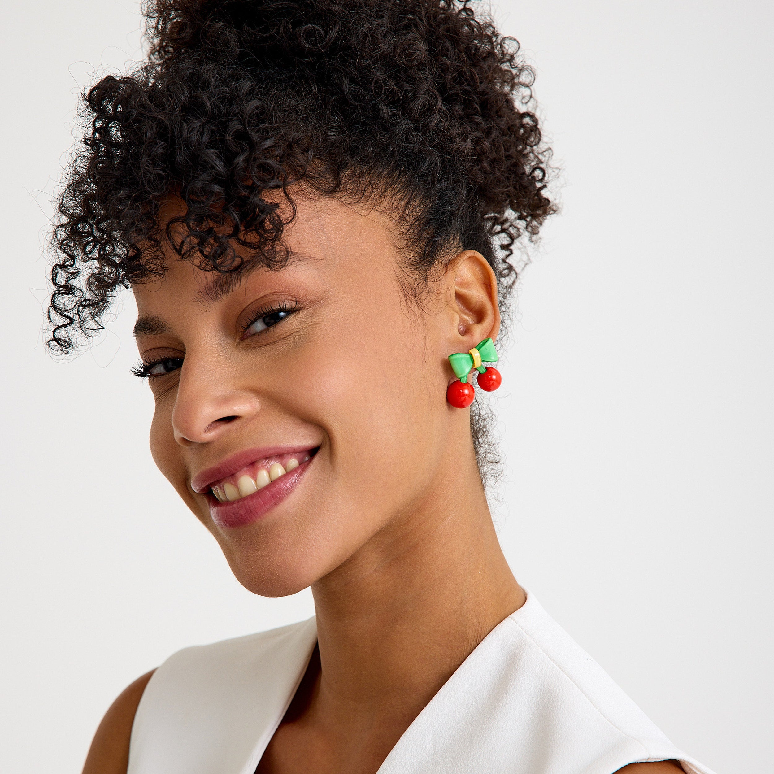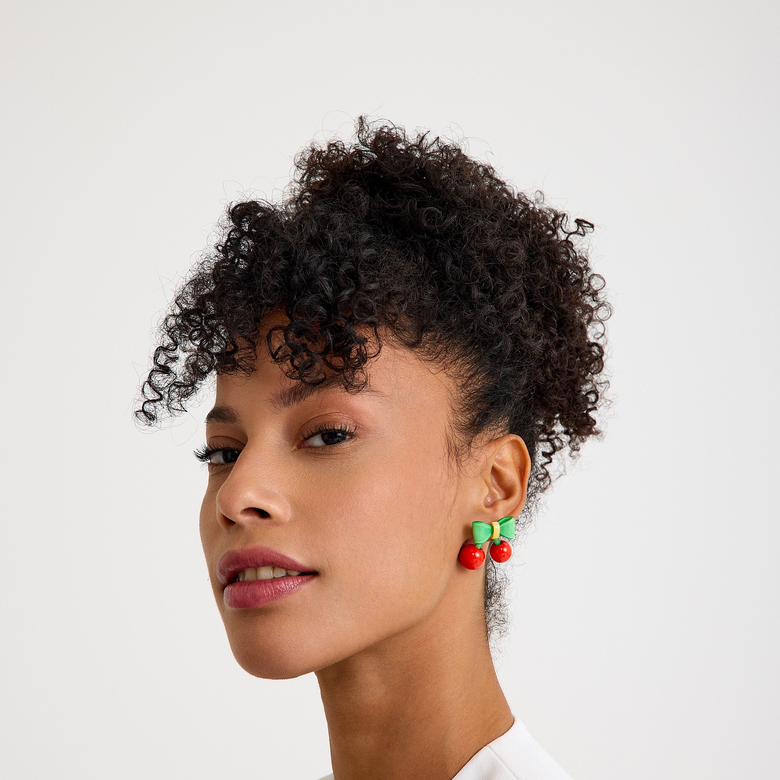 Cherry Pop Earring, retro esintili tasarımıyla enerjik ve eğlenceli bir stil sunar. Parlak kırmızı kiraz detayları ve yeşil fiyonk dokunuşu, genç ve neşeli bir görünüm yaratır. Günlük kombinlere renk katmak isteyenler için ideal bir parça!