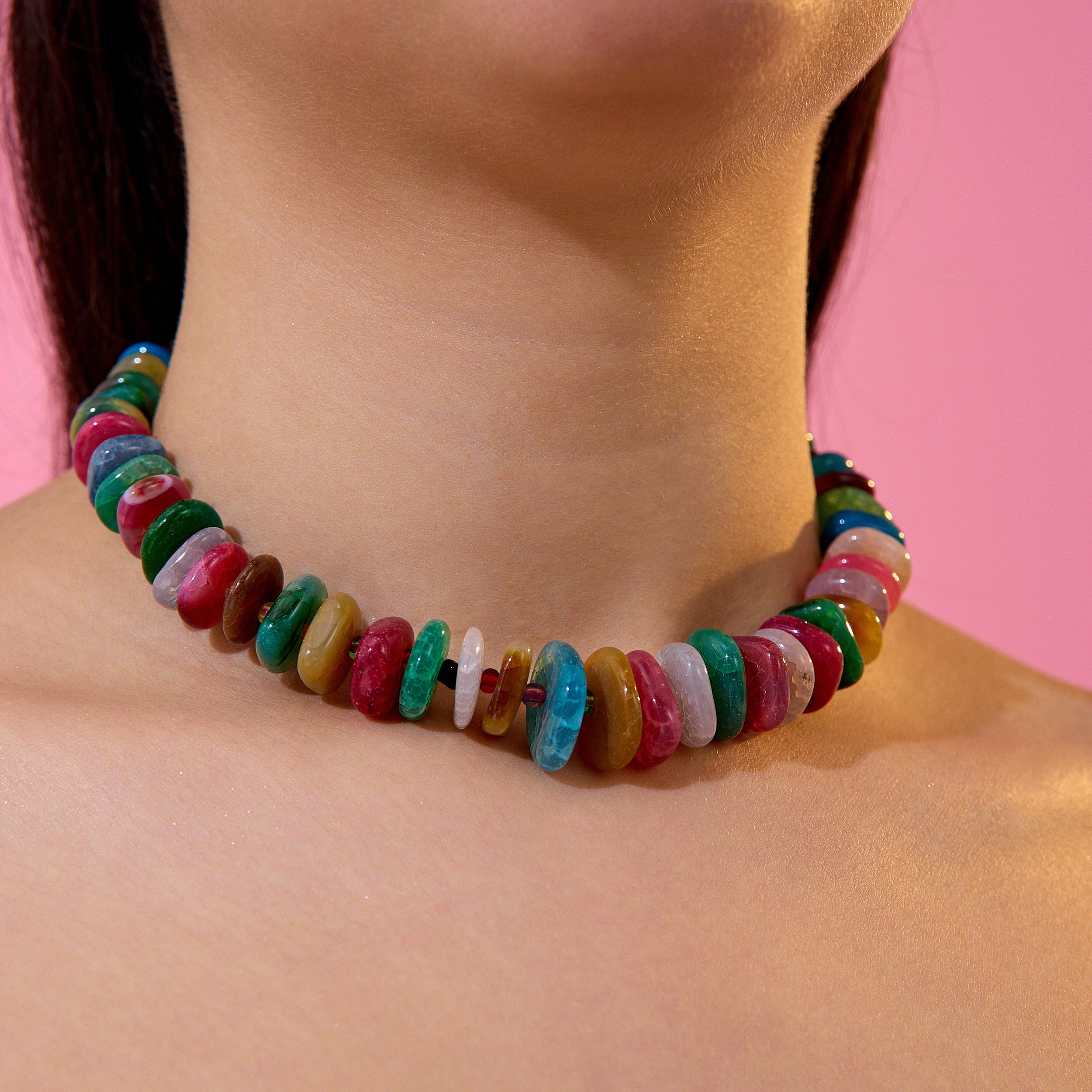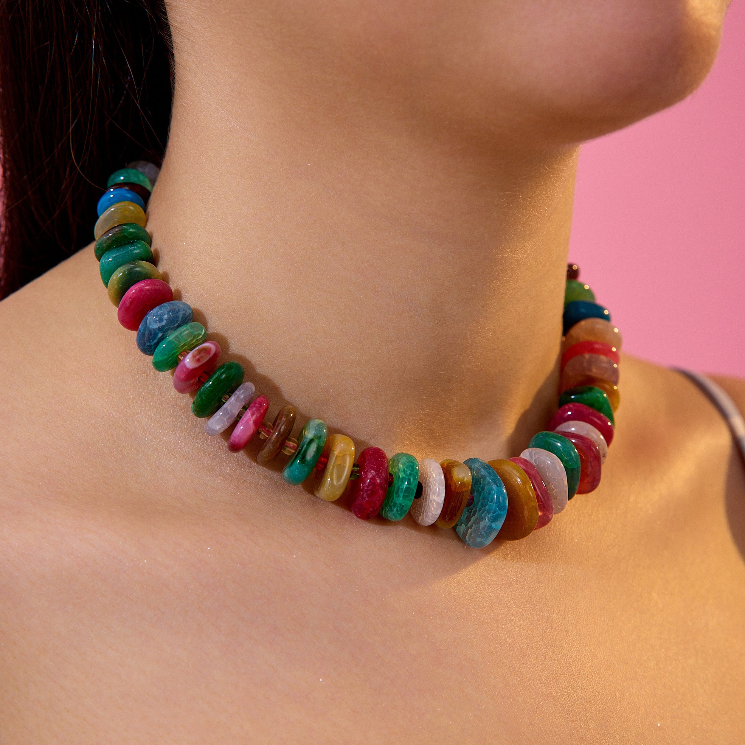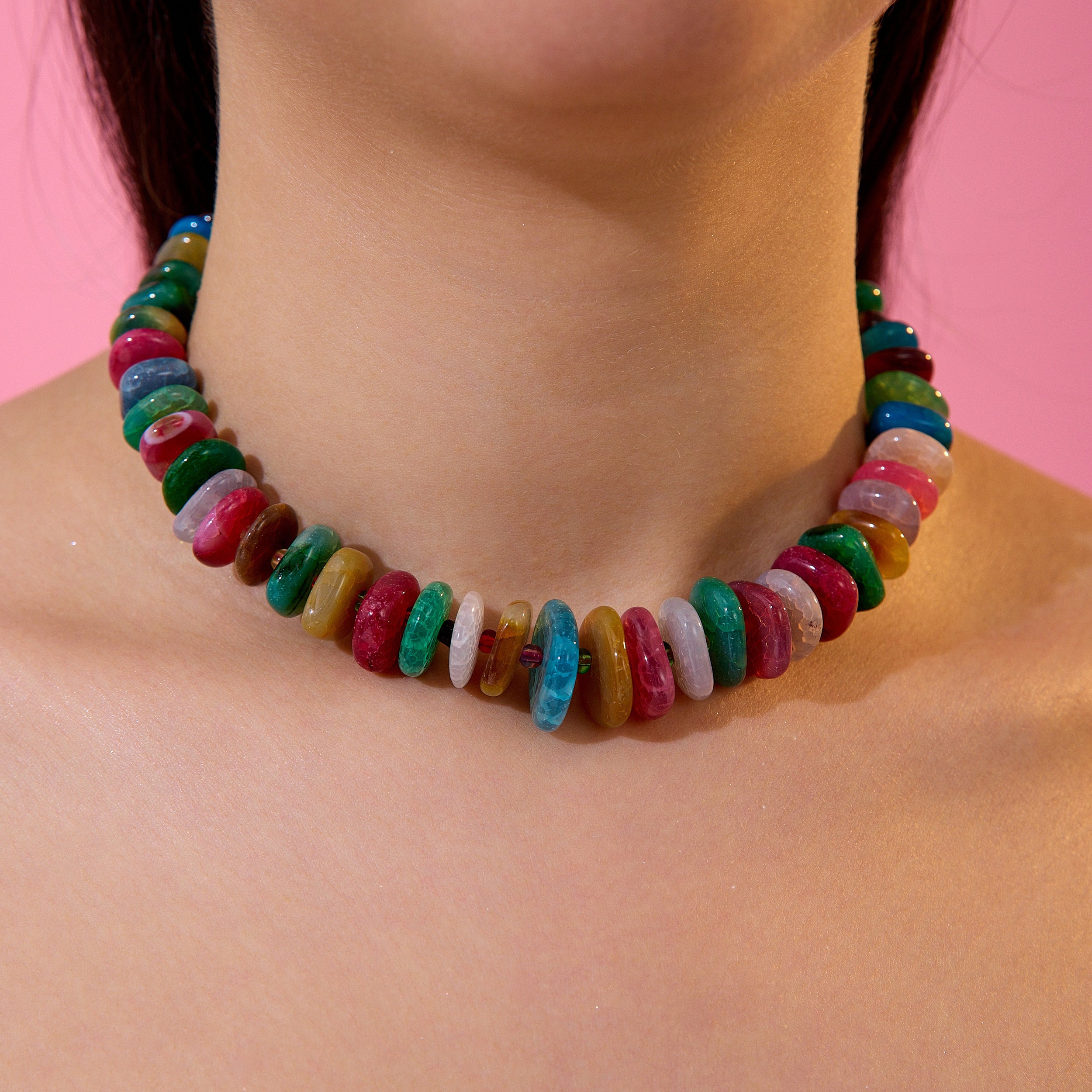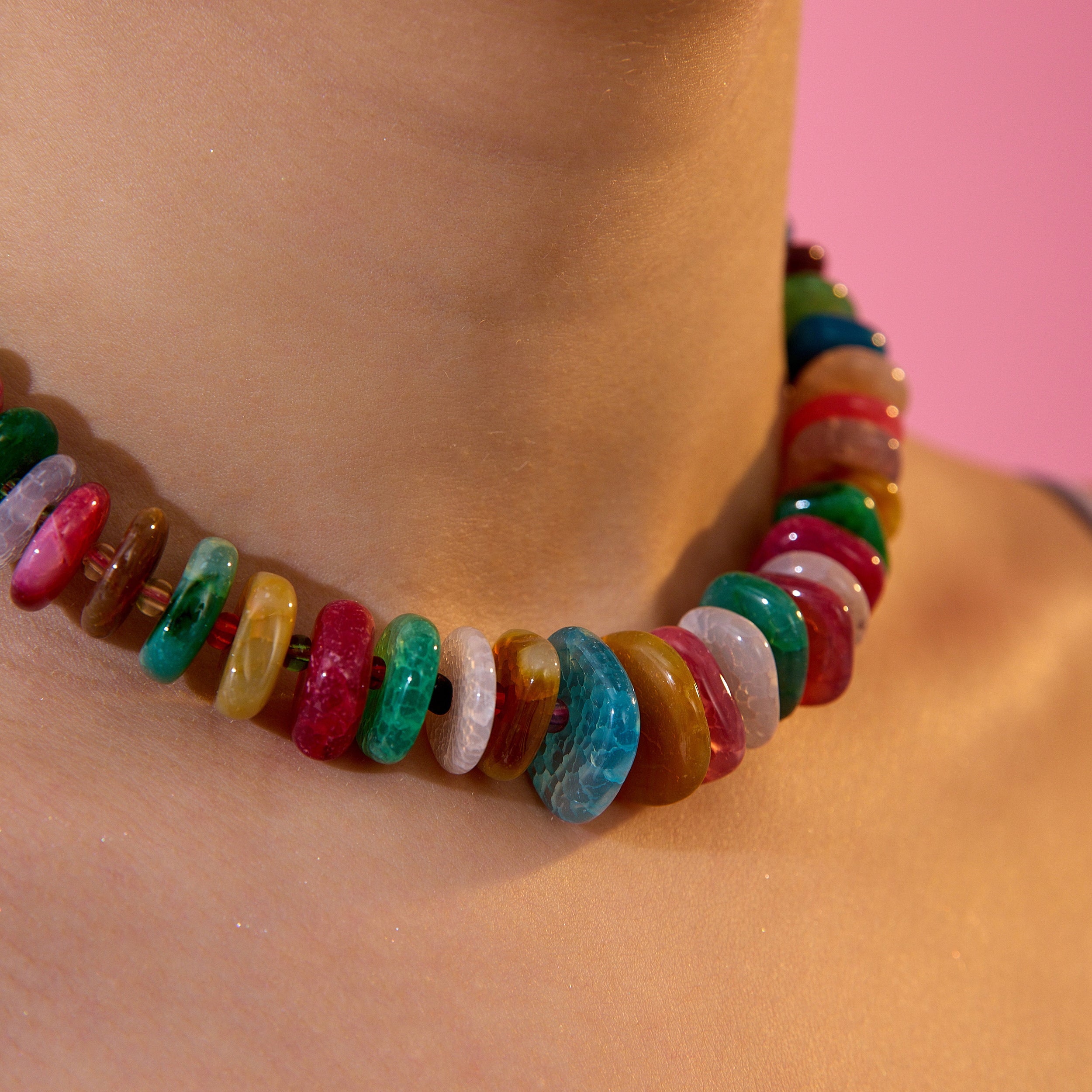 Renkli taşların en eğlenceli hali! Chunky Funk Tasarım Kolye, her biri özenle seçilmiş doğal akik taşları ile cesur ve neşeli bir görünüm sunuyor. Kalabalıkların içinden sıyrılmak isteyenler için tasarlandı!