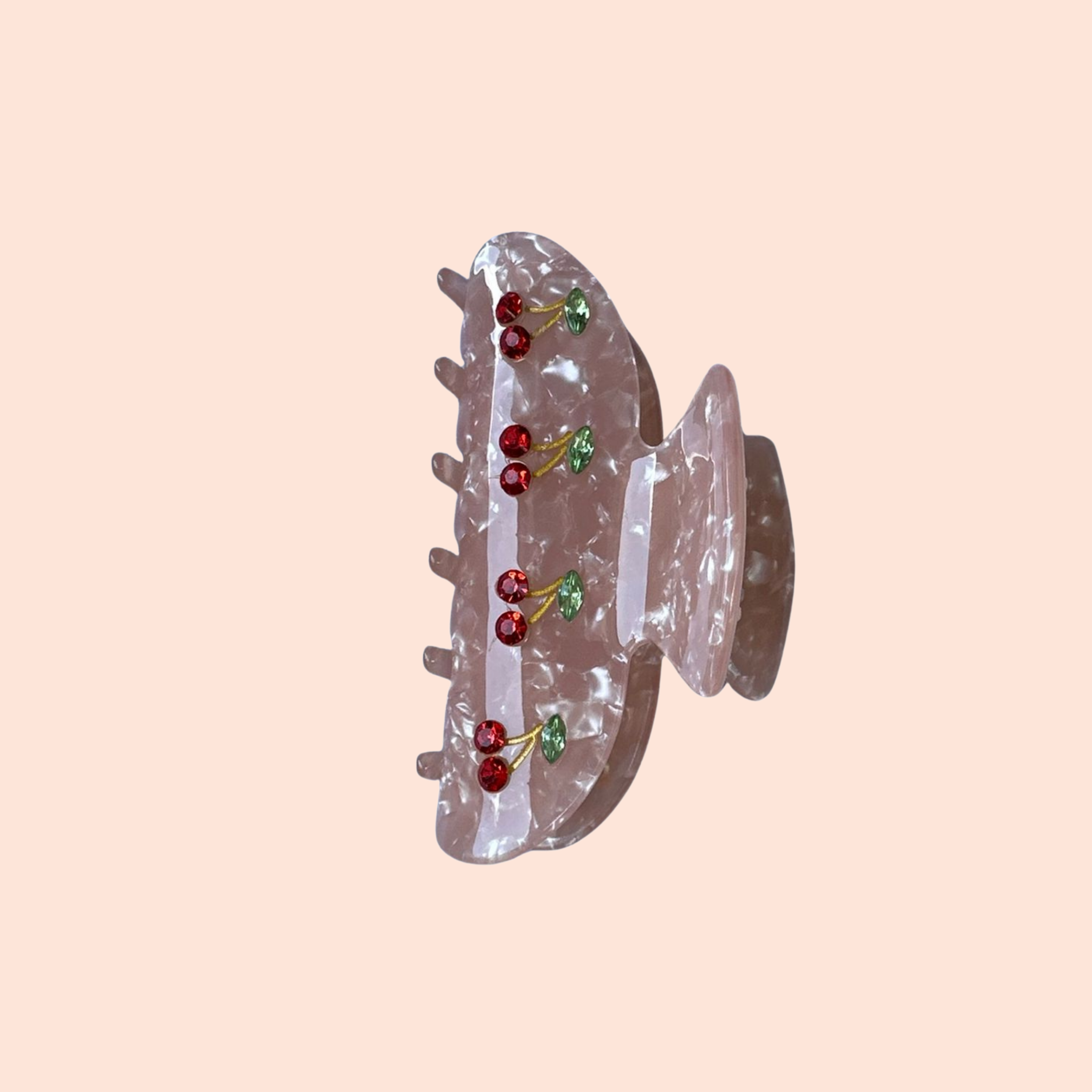 Tatlı mı tatlı kiraz figürleriyle süslenmiş bu özel Kiraz Rüyası Kemik Toka, zarafeti ve doğallığı saç stiline taşıyor. Yarı saydam pembe tonlarındaki kemik görünümlü yüzeyine yerleştirilmiş minik kiraz süslemeleriyle hem şık hem de eğlenceli bir görünüm sunar.