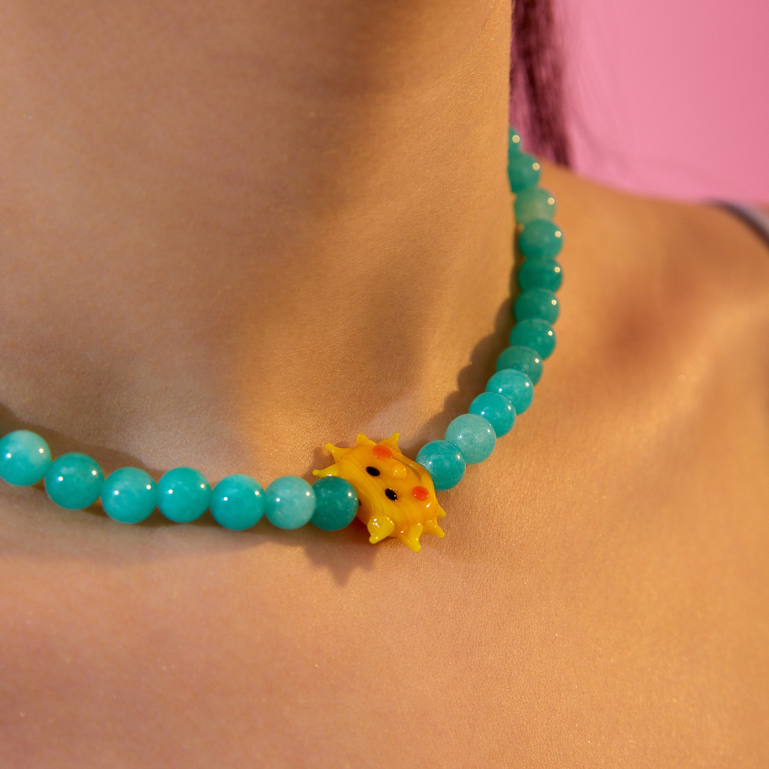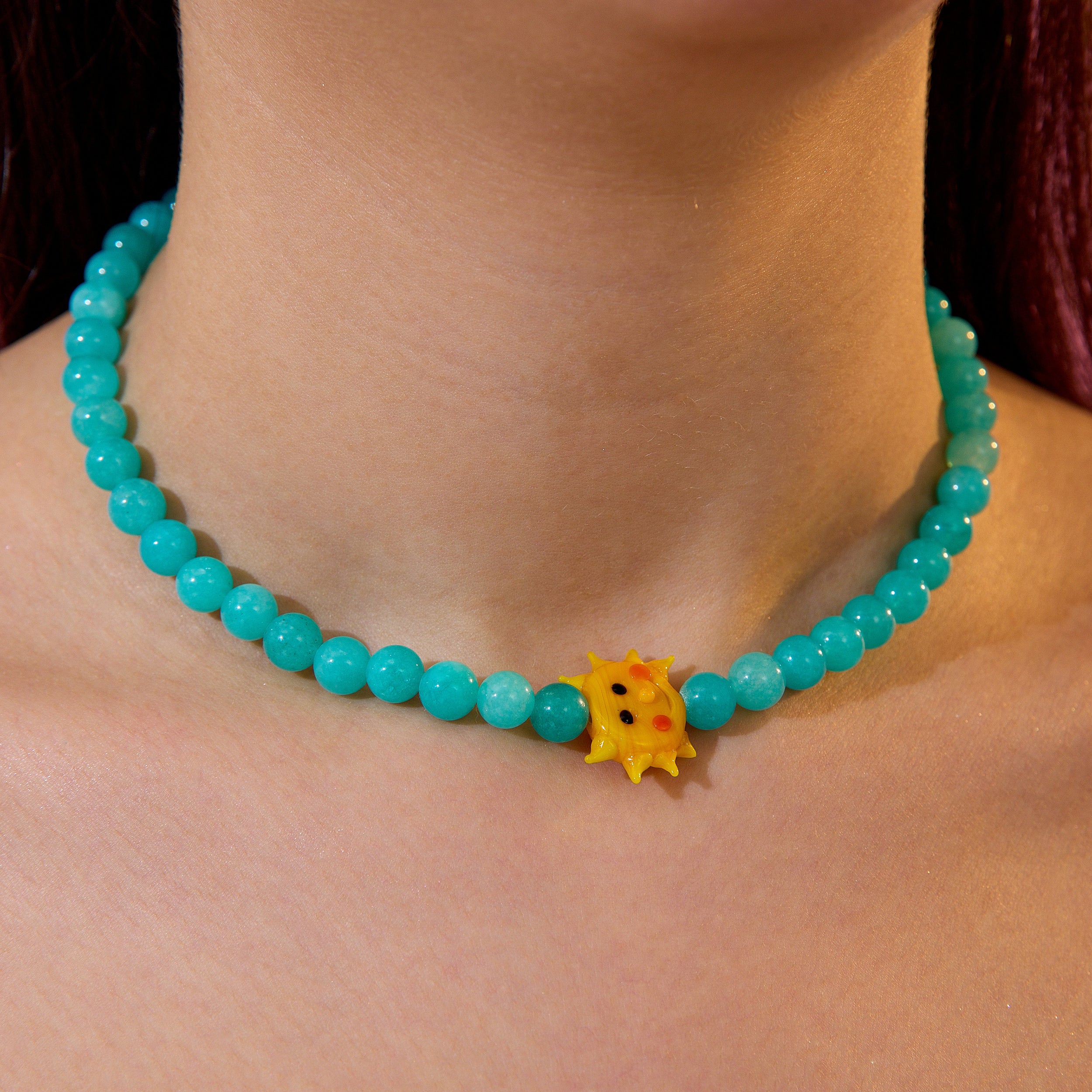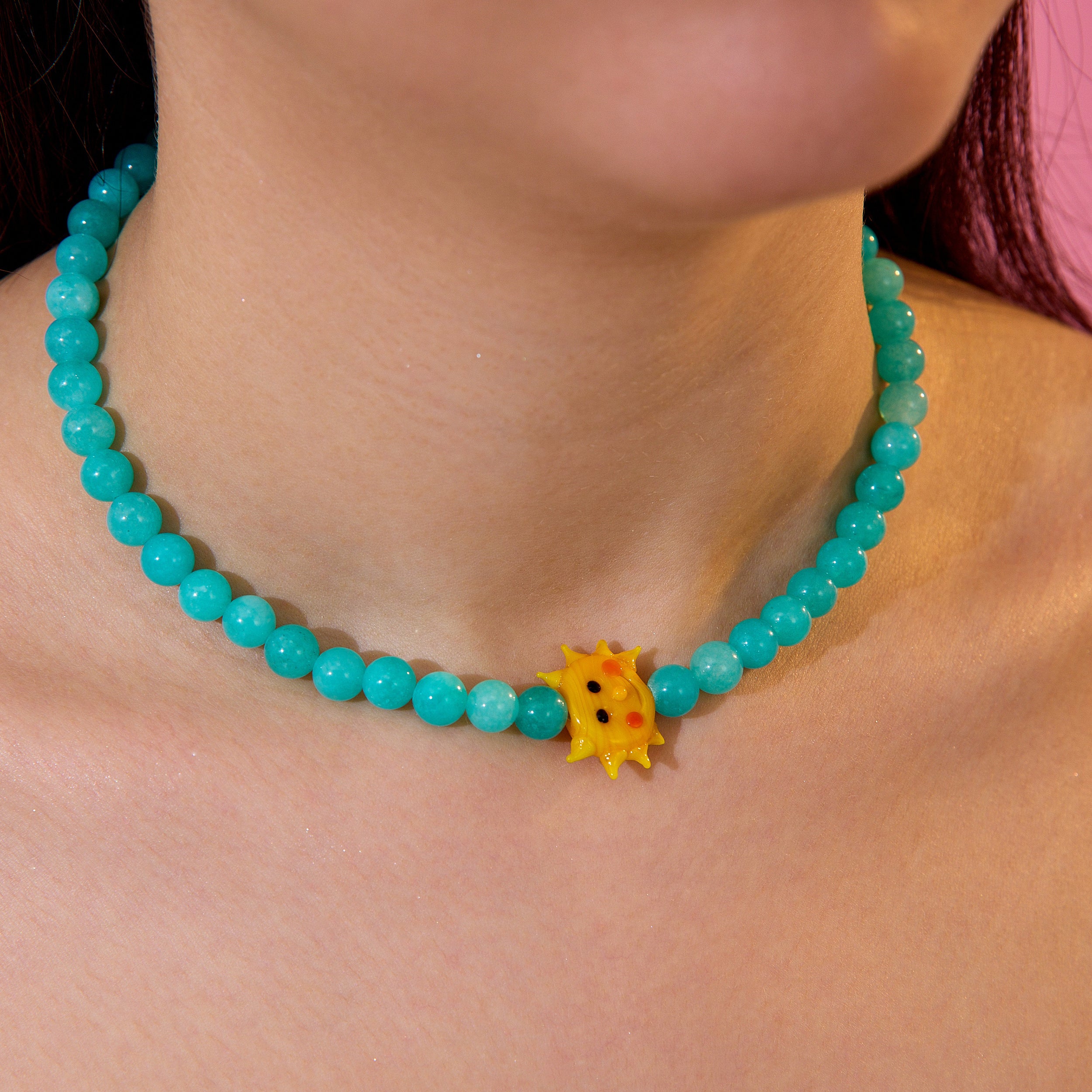 Güneşi yanında taşı! El yapımı neşeli güneş figürü ve sakinlik veren yeşim taşlarıyla tasarlanan Lil’ Sun Tasarım Kolye, pozitif enerjiyi teninde hissetmen için yaratıldı.