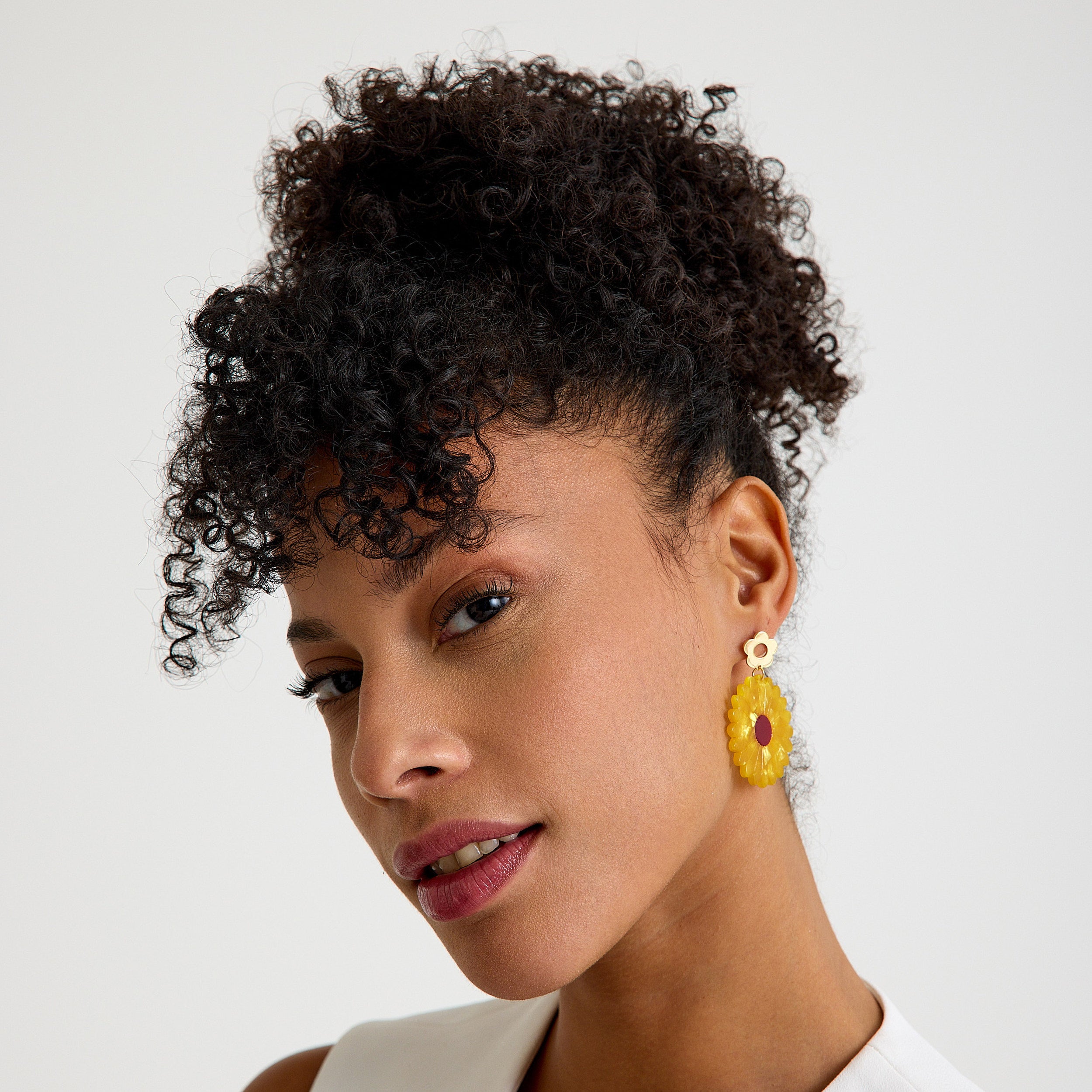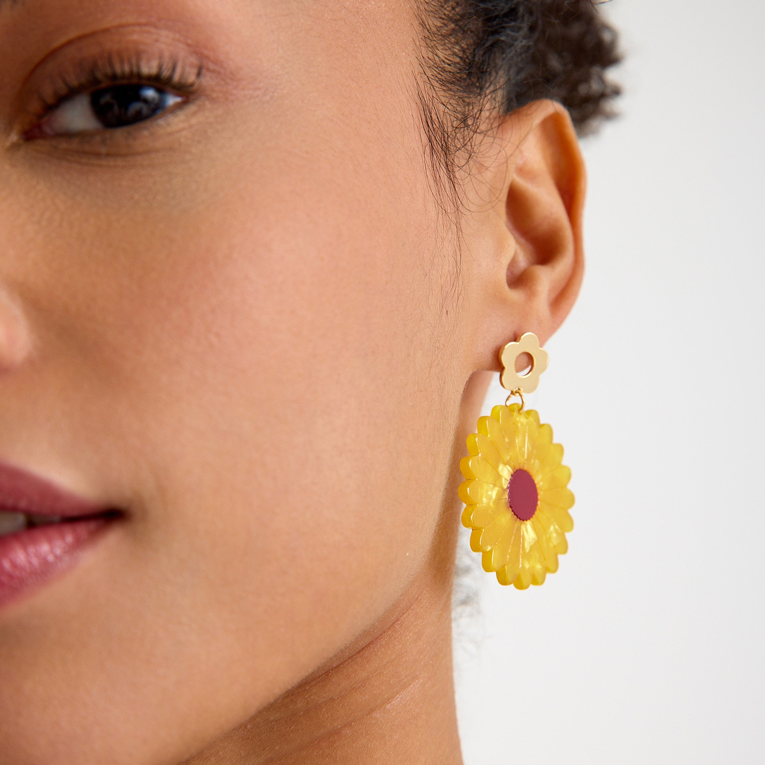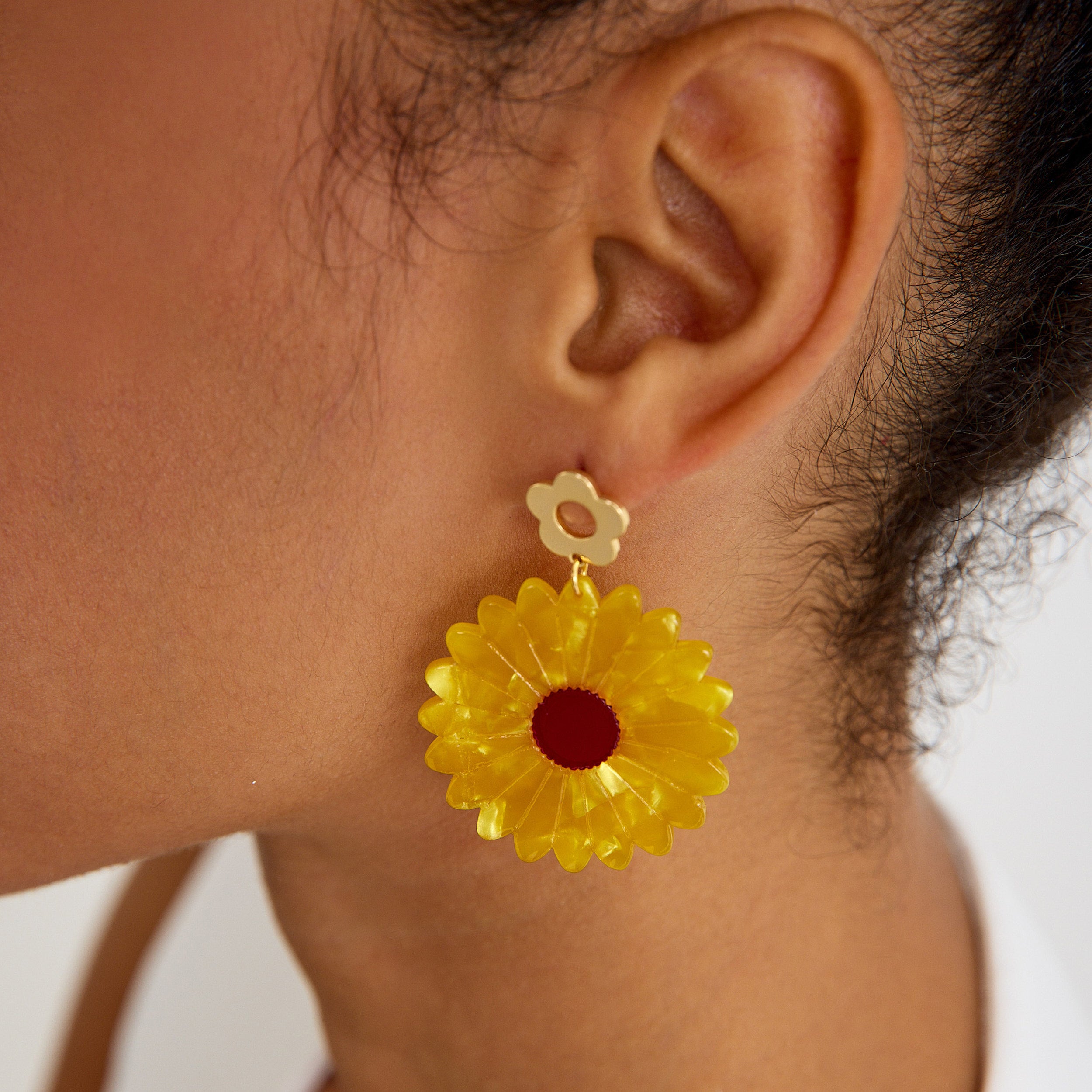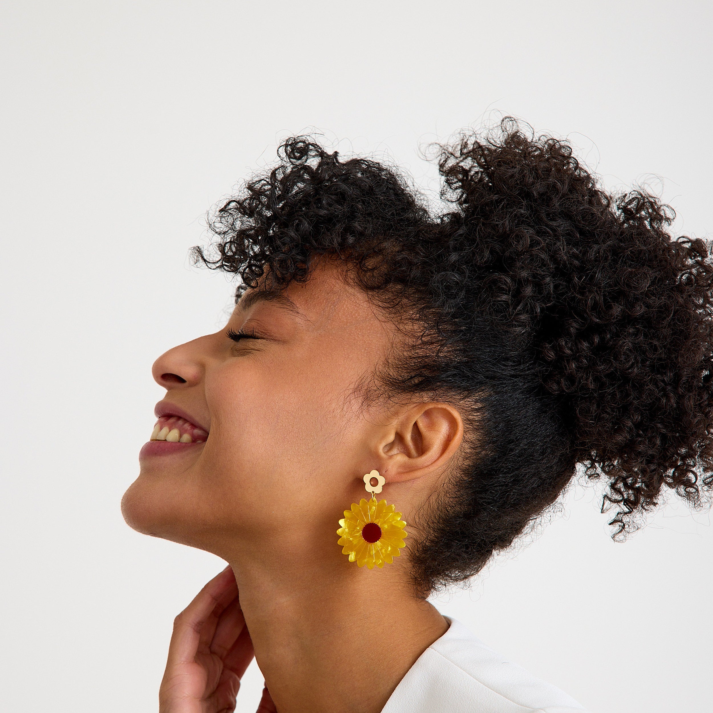 Sunbeam Bloom küpe, parlak bir yaz günü açmış ayçiçeği gibi neşe ve sıcaklık yayar. Şeffaf sarı çiçek formu, canlı kırmızı merkezi ve altın rengi papatya detayıyla dikkat çeken bu parça; enerjik, canlı ve pozitif bir tarzın simgesi. Özellikle yaz aylarında, festival ruhunu ya da günlük stilinize neşeli bir dokunuş katmak için ideal.